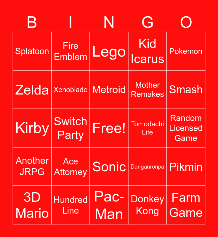 This bingo card has a free space and 24 words: Ace Attorney, Hundred Line, Metroid, 3D Mario, Pokemon, Splatoon, Zelda, Fire Emblem, Tomodachi Life, Sonic, Mother Remakes, Kirby, Danganronpa, Pikmin, Xenoblade, Donkey Kong, Random Licensed Game, Lego, Smash, Switch Party, Farm Game, Another JRPG, Kid Icarus and Pac-Man.