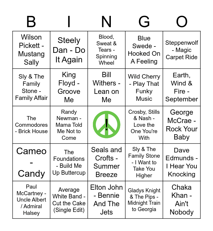 This bingo card has a free space and 50 words: The Beatles - A Hard Day's Night, Chaka Khan - Ain't Nobody, Four Tops - Baby I Need Your Loving, Elton John - Bennie And The Jets, The Foundations - Build Me Up Buttercup, DJ 70's Party Mix - Can't Get Enough of Your Love Baby, Steely Dan - Do It Again, Creedence Clearwater Revival - Down On The Corner, Sly & The Family Stone - Family Affair, Ohio Players - Fire (Ohio Players), King Floyd - Groove Me, Blue Swede - Hooked On A Feeling, Dave Edmunds - I Hear You Knocking, Sly & The Family Stone - I Want to Take You Higher, Harold Melvin & The Blue Notes - If You Don't Know Me by Now (feat. Teddy Pendergrass), The Rolling Stones - Jumpin' Jack Flash, Bill Withers - Lean on Me, Crosby, Stills & Nash - Love the One You're With, War - Low Rider, Steppenwolf - Magic Carpet Ride, Randy Newman - Mama Told Me Not to Come, Gladys Knight & The Pips - Midnight Train to Georgia, Wilson Pickett - Mustang Sally, Wild Cherry - Play That Funky Music, Aretha Franklin - Respect, Elton John - Rocket Man (I Think It's Going To Be A Long, Long Time), Earth, Wind & Fire - September, Ohio Players - Skin Tight, Blood, Sweat & Tears - Spinning Wheel, Seals and Crofts - Summer Breeze, The Guess Who - American Woman, Looking Glass - Brandy (You're a Fine Girl), Rose Royce - Car Wash, Harry Nilsson - Coconut, Average White Band - Cut the Cake (Single Edit), The Monkees - Daydream Believer, Pockets - Come Go With Me, War - Slippin' Into Darkness, The O'Jays - Back Stabbers, George McCrae - Rock Your Baby, Tony Orlando - Knock Three Times, Fleetwood Mac - Dreams (Live at Palais du Sport, Paris, France, 6/14/1980), Janis Joplin - Me and Bobby McGee, Janis Joplin - Me and Bobby McGee, Paul McCartney - Uncle Albert / Admiral Halsey, The Commodores - Brick House, Heatwave - Always and Forever, The Staple Singers - I'll Take You There, Cameo - Candy and Lakeside - Fantastic Voyage.