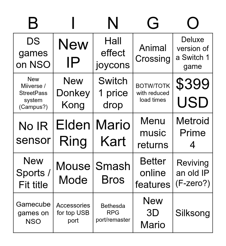This bingo card has a free space and 24 words: Mouse Mode, Accessories for top USB port, Switch 1 price drop, Gamecube games on NSO, Deluxe version of a Switch 1 game, DS games on NSO, New Miiverse / StreetPass system (Campus?), New IP, Menu music returns, Smash Bros, BOTW/TOTK with reduced load times, No IR sensor, Better online features, Reviving an old IP (F-zero?), New Donkey Kong, New 3D Mario, Metroid Prime 4, Hall effect joycons, $399 USD, Elden Ring, Silksong, New Sports / Fit title, Animal Crossing and Bethesda RPG port/remaster.