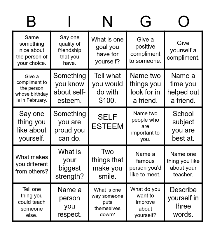 This bingo card has a free space and 24 words: Tell one thing you could teach someone else., What is your biggest strength?, Tell what you would do with $100., What do you want to improve about yourself?, Give yourself a compliment., Same something nice about the person of your choice., Say one quality of friendship that you have., What is one goal you have for yourself?, Name two people who are important to you., School subject you are best at., Say one thing you like about yourself., Something you know about self-esteem., Name a famous person you'd like to meet., Name one thing you like about your teacher., Give a compliment to the person whose birthday is in February., Name a person you respect., What is one way someone puts themselves down?, Give a positive compliment to someone., Name a time you helped out a friend., What makes you different from others?, Something you are proud you can do., Two things that make you smile., Name two things you look for in a friend. and Describe yourself in three words..