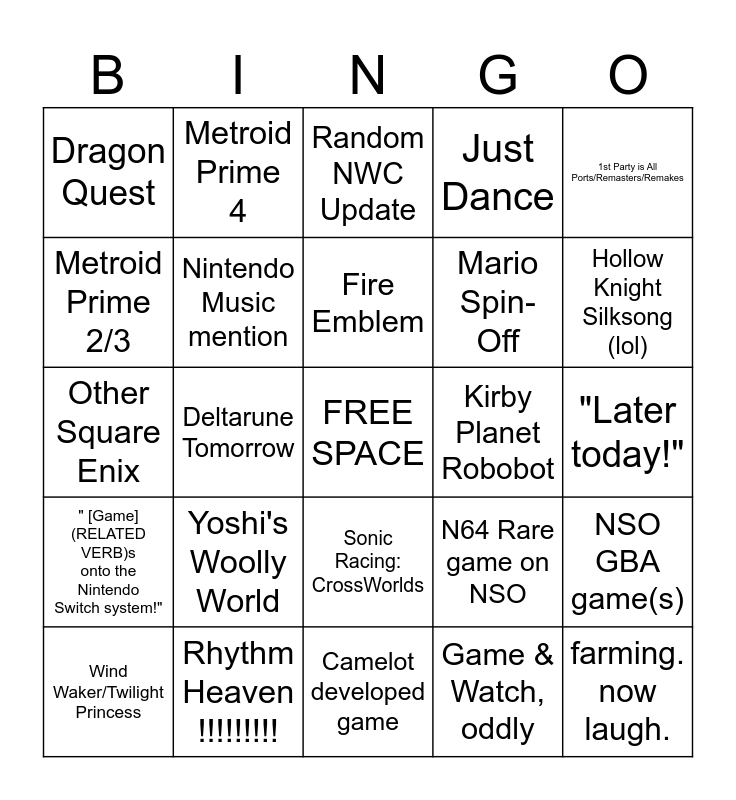 This bingo card has a free space and 24 words: Yoshi's Woolly World, Rhythm Heaven !!!!!!!!!, Fire Emblem, Wind Waker/Twilight Princess, 1st Party is All Ports/Remasters/Remakes, Dragon Quest, Metroid Prime 2/3, Metroid Prime 4, Kirby Planet Robobot, Sonic Racing: CrossWorlds, Mario Spin-Off, Other Square Enix, N64 Rare game on NSO, NSO GBA game(s), Nintendo Music mention, Game & Watch, oddly, "Later today!", Random NWC Update, Hollow Knight Silksong (lol), Deltarune Tomorrow, farming. now laugh., " [Game] (RELATED VERB)s onto the Nintendo Switch system!", Just Dance and Camelot developed game.