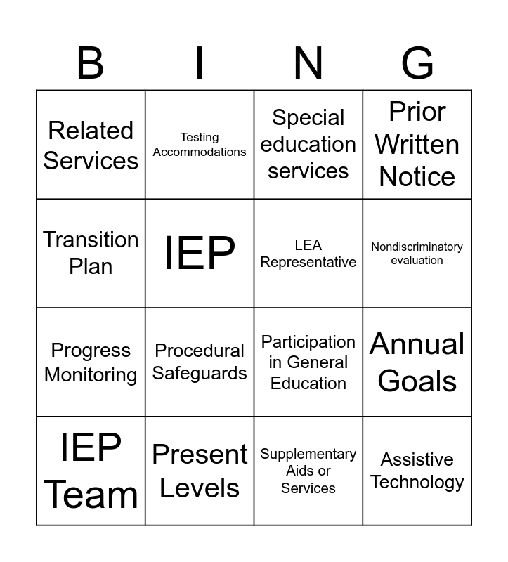 This bingo card has 16 words: Present Levels, Annual Goals, Special education services, Related Services, Progress Monitoring, Testing Accommodations, Participation in General Education, Supplementary Aids or Services, Transition Plan, IEP, IEP Team, Prior Written Notice, Procedural Safeguards, Nondiscriminatory evaluation, LEA Representative and Assistive Technology.