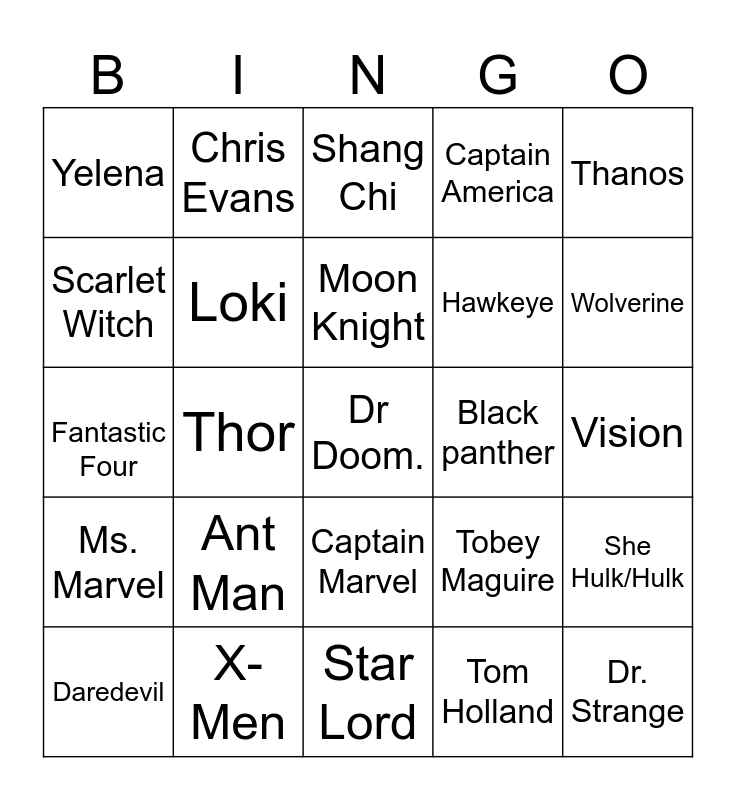 This bingo card has a free space and 24 words: Ant Man, X-Men, Moon Knight, Daredevil, Thanos, Yelena, Scarlet Witch, Chris Evans, Black panther, Captain Marvel, Hawkeye, Fantastic Four, Tobey Maguire, She Hulk/Hulk, Loki, Tom Holland, Vision, Shang Chi, Wolverine, Thor, Dr. Strange, Ms. Marvel, Captain America and Star Lord.
