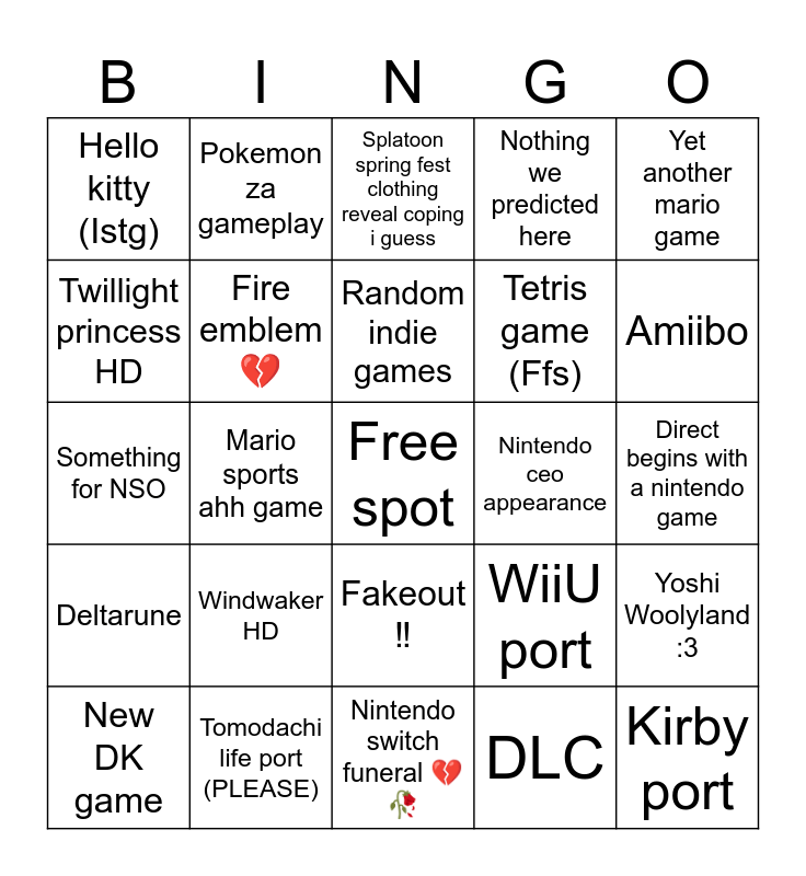 This bingo card has a free space and 24 words: Windwaker HD, Tomodachi life port (PLEASE), Random indie games, New DK game, Yet another mario game, Hello kitty (Istg), Twillight princess HD, Pokemon za gameplay, Nintendo ceo appearance, Fakeout ‼️, Tetris game (Ffs), Something for NSO, WiiU port, Yoshi Woolyland :3, Fire emblem 💔, DLC, Direct begins with a nintendo game, Splatoon spring fest clothing reveal coping i guess, Amiibo, Mario sports ahh game, Kirby port, Deltarune, Nothing we predicted here and Nintendo switch funeral 💔🥀.