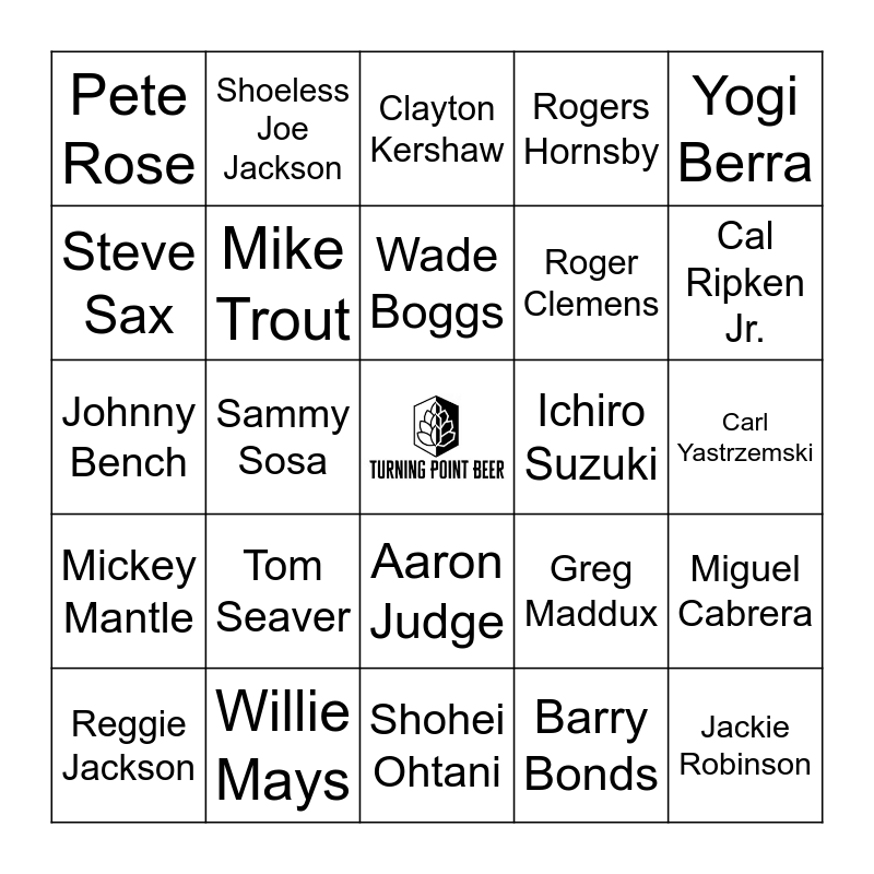 This bingo card has a free space and 58 words: Babe Ruth, Willie Mays, Lou Gehrig, Mickey Mantle, Barry Bonds, Ken Griffey Jr., Mike Trout, Joe DiMaggio, Roger Clemens, Mike Schmidt, Rogers Hornsby, Alex Rodridguez, Derek Jeter, Albert Pujols, Sandy Koufax, Pete Rose, Jackie Robinson, Yogi Berra, Nolan Ryan, Wade Boggs, Ichiro Suzuki, Clayton Kershaw, Reggie Jackson, Miguel Cabrera, Whitey Ford, Carl Yastrzemski, Mel Ott, David Ortiz, Cal Ripken Jr., Justin Verlander, Willie McCovey, Adrian Beltre, Darryl Strawberry, Ty Cobb, Mark McGwire, Don Mattingly, Jose Canseco, Sammy Sosa, Johnny Bench, Bob Gibson, Tom Seaver, Frank Robinson, Greg Maddux, Honus Wagner, Randy Johnson, Ted Williams, Hank Aaron, Aaron Judge, Shohei Ohtani, Max Scherzer, Bryce Harper, Buster Posey, Roberto Clemente, Satchel Paige, Shoeless Joe Jackson, Ozzie Smith, Steve Sax and Mike Scioscia.