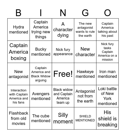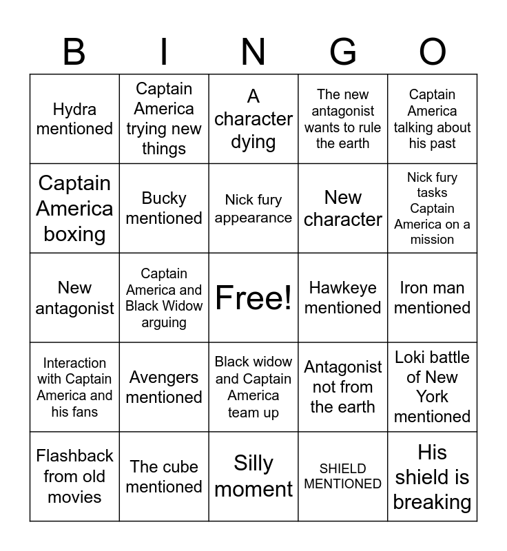 This bingo card has a free space and 24 words: Avengers mentioned, The cube mentioned, Nick fury appearance, Flashback from old movies, Captain America talking about his past, Hydra mentioned, Captain America boxing, Captain America trying new things, Hawkeye mentioned, Black widow and Captain America team up, New character, New antagonist, Antagonist not from the earth, Loki battle of New York mentioned, Bucky mentioned, SHIELD MENTIONED, Iron man mentioned, A character dying, Nick fury tasks Captain America on a mission, Captain America and Black Widow arguing, His shield is breaking, Interaction with Captain America and his fans, The new antagonist wants to rule the earth and Silly moment.