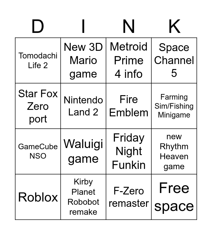 This bingo card has 16 words: Kirby Planet Robobot remake, new Rhythm Heaven game, Metroid Prime 4 info, Tomodachi Life 2, GameCube NSO, New 3D Mario game, Friday Night Funkin, F-Zero remaster, Star Fox Zero port, Nintendo Land 2, Roblox, Space Channel 5, Waluigi game, Farming Sim/Fishing Minigame, Fire Emblem and Free space.