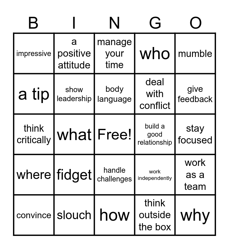 This bingo card has a free space and 24 words: fidget, slouch, body language, convince, mumble, impressive, a tip, a positive attitude, build a good relationship, handle challenges, deal with conflict, think critically, work independently, work as a team, show leadership, think outside the box, stay focused, manage your time, give feedback, what, why, where, who and how.
