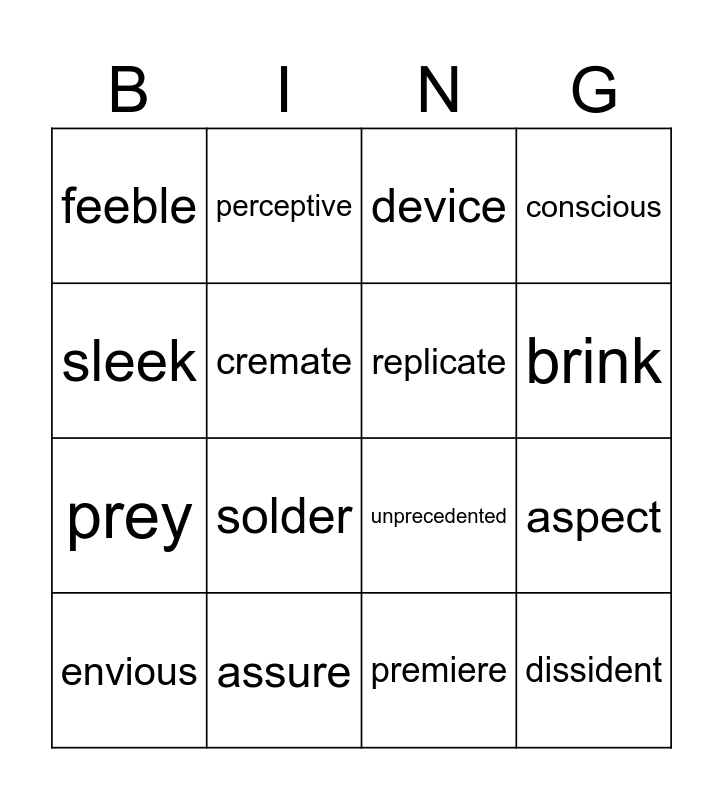 This bingo card has 16 words: assure, aspect, device, feeble, prey, perceptive, unprecedented, premiere, sleek, cremate, envious, conscious, solder, brink, replicate and dissident.