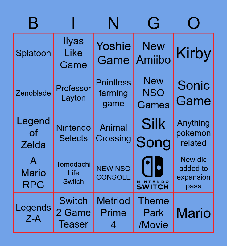This bingo card has 1 images and 24 words: Tomodachi Life Switch, Metriod Prime 4, Pointless farming game, Legends Z-A, Kirby, Splatoon, Zenoblade, Ilyas Like Game, Silk Song, NEW NSO CONSOLE, New NSO Games, Legend of Zelda, New dlc added to expansion pass, Professor Layton, Mario, Anything pokemon related, Yoshie Game, Sonic Game, Nintendo Selects, Animal Crossing, Switch 2 Game Teaser, A Mario RPG, New Amiibo and Theme Park /Movie.