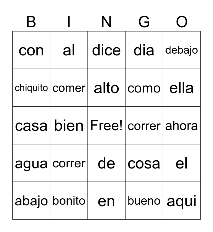 This bingo card has a free space and 24 words: correr, bonito, alto, abajo, debajo, con, chiquito, al, correr, de, como, casa, cosa, el, comer, bueno, ahora, dice, ella, bien, aqui, agua, dia and en.
