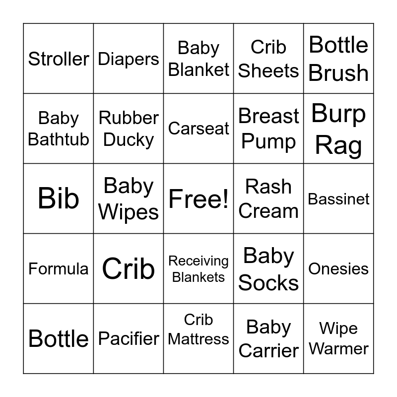 This bingo card has a free space and 24 words: Crib, Pacifier, Carseat, Bottle, Bottle Brush, Stroller, Baby Bathtub, Diapers, Rash Cream, Receiving Blankets, Breast Pump, Bib, Baby Socks, Onesies, Rubber Ducky, Baby Carrier, Bassinet, Baby Blanket, Burp Rag, Baby Wipes, Wipe Warmer, Formula, Crib Sheets and Crib Mattress.