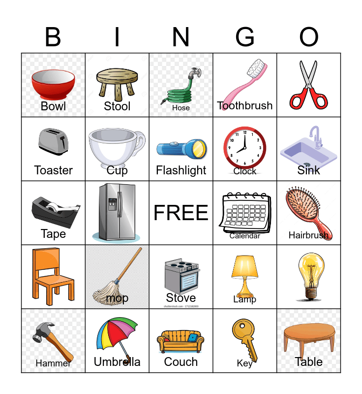 This bingo card has 26 images, a free space and 22 words: Stove, Key, Flashlight, Umbrella, Bowl, Toaster, Stool, Hairbrush, Lamp, Clock, Tape, Hammer, Blanket, Toothbrush, Hose, Table, Sink, Couch, Calendar, mop, Cup and Computer.