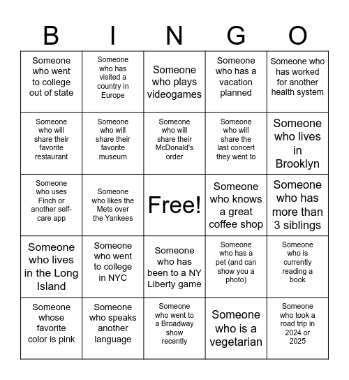 This bingo card has a free space and 24 words: Someone who went to college in NYC, Someone who speaks another language, Someone who will share their McDonald's order, Someone whose favorite color is pink, Someone who has worked for another health system, Someone who went to college out of state, Someone who will share their favorite restaurant, Someone who has visited a country in Europe, Someone who knows a great coffee shop, Someone who has been to a NY Liberty game, Someone who will share the last concert they went to, Someone who uses Finch or another self-care app, Someone who has a pet (and can show you a photo), Someone who is currently reading a book, Someone who will share their favorite museum, Someone who is a vegetarian, Someone who has more than 3 siblings, Someone who plays videogames, Someone who lives in Brooklyn, Someone who likes the Mets over the Yankees, Someone who took a road trip in 2024 or 2025, Someone who lives in the Long Island, Someone who has a vacation planned and Someone who went to a Broadway show recently.