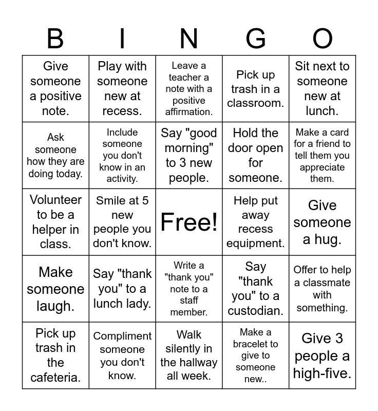 This bingo card has a free space and 24 words: Say "thank you" to a lunch lady., Compliment someone you don't know., Say "good morning" to 3 new people., Pick up trash in the cafeteria., Sit next to someone new at lunch., Give someone a positive note., Ask someone how they are doing today., Play with someone new at recess., Help put away recess equipment., Write a "thank you" note to a staff member., Hold the door open for someone., Volunteer to be a helper in class., Say "thank you" to a custodian., Offer to help a classmate with something., Include someone you don't know in an activity., Make a bracelet to give to someone new.., Give someone a hug., Leave a teacher a note with a positive affirmation., Make a card for a friend to tell them you appreciate them., Smile at 5 new people you don't know., Give 3 people a high-five., Make someone laugh., Pick up trash in a classroom. and Walk silently in the hallway all week..