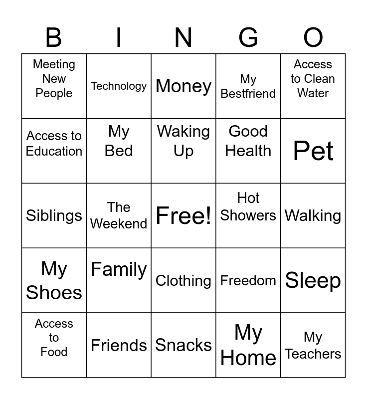 This bingo card has a free space and 24 words: Family, Friends, Waking Up, Access to Food, Access to Clean Water, Meeting New People, Access to Education, Technology, Hot Showers, Clothing, Good Health, Siblings, Freedom, Sleep, My Bed, My Home, Walking, Money, Pet, The Weekend, My Teachers, My Shoes, My Bestfriend and Snacks.