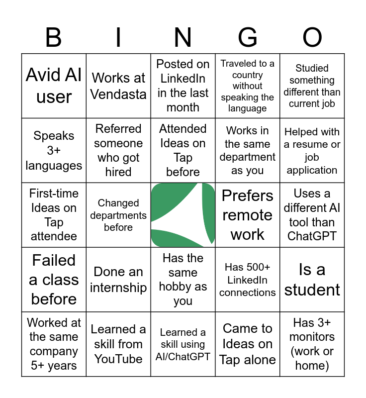This bingo card has a free space and 24 words: Worked at the same company 5+ years, Done an internship, Attended Ideas on Tap before, Came to Ideas on Tap alone, Studied something different than current job, Avid AI user, Works at Vendasta, Posted on LinkedIn in the last month, Prefers remote work, Uses a different AI tool than ChatGPT, First-time Ideas on Tap attendee, Referred someone who got hired, Has 500+ LinkedIn connections, Is a student, Speaks 3+ languages, Learned a skill from YouTube, Learned a skill using AI/ChatGPT, Traveled to a country without speaking the language, Helped with a resume or job application, Failed a class before, Changed departments before, Has the same hobby as you, Works in the same department as you and Has 3+ monitors (work or home).