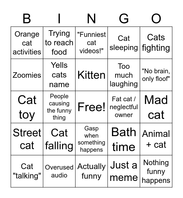 This bingo card has a free space and 24 words: Cat falling, Overused audio, Kitten, Cat "talking", Cats fighting, Orange cat activities, Zoomies, Trying to reach food, Fat cat / neglectful owner, Gasp when something happens, Too much laughing, Cat toy, Bath time, Animal + cat, Yells cats name, Just a meme, Mad cat, "Funniest cat videos!", "No brain, only floof", People causing the funny thing, Nothing funny happens, Street cat, Cat sleeping and Actually funny.