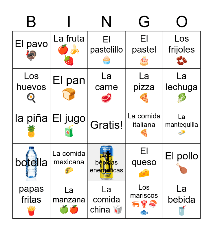 This bingo card has 7 images, a free space and 52 words: El agua ๐ง, La bebida ๐ฅค, El cereal ๐ฅฃ, La comida china ๐ฅก, La comida mexicana ๐ฎ, El espagueti ๐, La fruta ๐๐๐, La hamburguesa ๐, Los huevos ๐ณ, La leche ๐ฅ, El pan ๐, El pescado ๐, El pollo ๐, El queso ๐ง, El sรกndwich ๐ฅช, Las verduras ๐ฅ๐ฅฆ, La carne ๐ฅฉ, La comida italiana ๐, El yogur, Los frijoles ๐ซ, El jugo๐ง, Los mariscos ๐ฆ๐ฆ๐ฃ๐, El pavo ๐ฆ, La pizza ๐, El cerdo ๐, Las fresas ๐, El plรกtano ๐, Las espinacas, La lechuga ๐ฅฌ, La zanahoria ๐ฅ, Las galletas ๐ช, El pastel ๐, Las uvas ๐, El postre ๐ฐ๐ง, El flan ๐ฎ, El pastelillo ๐ง, La manzana ๐๐, La pera ๐, El mango ๐ฅญ, La sandรญa ๐, El durazno ๐, La mantequilla ๐ง, botella, Las bebidas deportivas, Las bebidas energeticas, El helado ๐จ, refrescos, la piรฑa ๐, El arroz ๐, El aguacate ๐ฅ, papas fritas ๐ and El jamรณn.