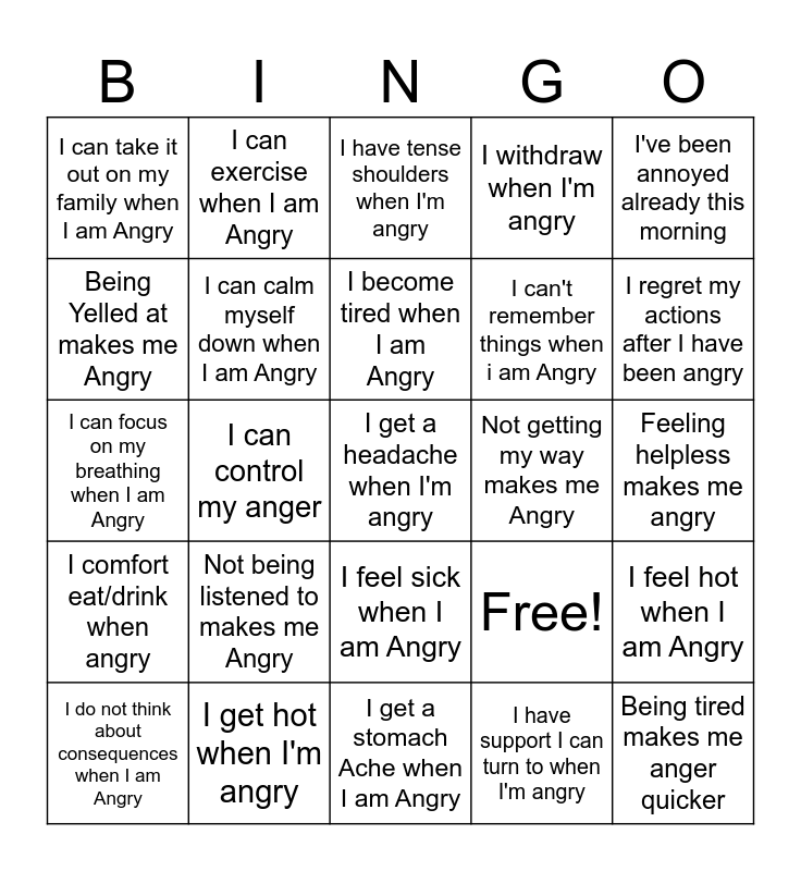 This bingo card has 25 words: Not being listened to makes me Angry, I get a stomach Ache when I am Angry, I become tired when I am Angry, I do not think about consequences when I am Angry, I've been annoyed already this morning, I can take it out on my family when I am Angry, Being Yelled at makes me Angry, I can exercise when I am Angry, Not getting my way makes me Angry, I feel sick when I am Angry, I can't remember things when i am Angry, I can focus on my breathing when I am Angry, Free!, I feel hot when I am Angry, I can calm myself down when I am Angry, Being tired makes me anger quicker, Feeling helpless makes me angry, I have tense shoulders when I'm angry, I regret my actions after I have been angry, I can control my anger, I get a headache when I'm angry, I get hot when I'm angry, I comfort eat/drink when angry, I withdraw when I'm angry and I have support I can turn to when I'm angry.