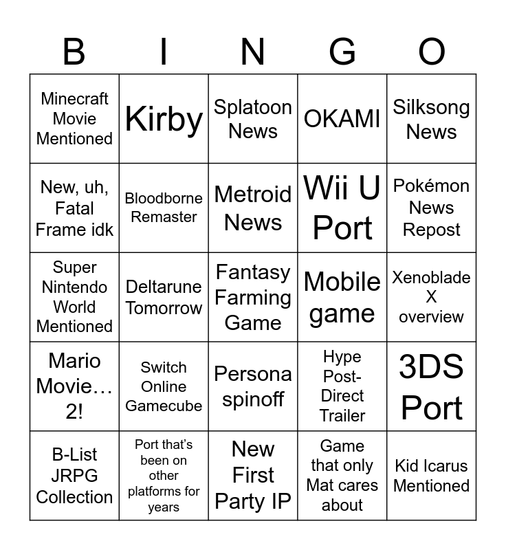 This bingo card has a free space and 24 words: Switch Online Gamecube, Port that’s been on other platforms for years, Metroid News, B-List JRPG Collection, Silksong News, Minecraft Movie Mentioned, New, uh, Fatal Frame idk, Kirby, Mobile game, Persona spinoff, Wii U Port, Super Nintendo World Mentioned, Hype Post-Direct Trailer, 3DS Port, Bloodborne Remaster, Game that only Mat cares about, Xenoblade X overview, Splatoon News, Pokémon News Repost, Deltarune Tomorrow, Kid Icarus Mentioned, Mario Movie…2!, OKAMI and New First Party IP.