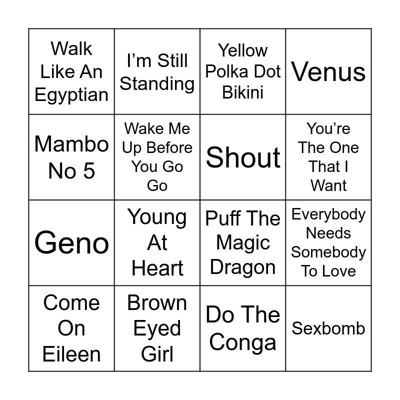 This bingo card has 50 words: Never Gonna Give You Up, Come On Eileen, I Wanna Dance With Somebody, Footloose, I’m So Excited, Summer Of '69, I’m Still Standing, Making Your Mind Up, Wake Me Up Before You Go Go, Hot Stuff, Shout, Venus, Dancing Queen, Don’t Stop Me Now, Saturday Night, Kung Fu Fighting, You’re The One That I Want, Brown Eyed Girl, We Are Family, Mambo No 5, Everybody Needs Somebody To Love, I Will Survive, Walk Like An Egyptian, Geno, Rivers Of Babylon, Going Underground, Young At Heart, You Sexy Thing, Yellow Polka Dot Bikini, Cheeky Song, Agadoo, Cotton Eye Joe, Macarena, Boom Boom Boom Boom, Stop, Angels, Year 3000, Uptown Girl, Vindaloo, Do The Conga, The Chicken Song, Shaddap Your Face, Rockin' All Over The World, My Old Man’s A Dustman, When I’m Cleaning Windows, Puff The Magic Dragon, Hokey Cokey, Baby One More Time, Sexbomb and Reach.