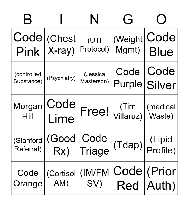 This bingo card has a free space and 47 words: (BIG 3), (Prior Auth), (Dr. Jane Liang), (IM/FM SV), (Good Rx), (thumbs up), (Chest X-ray), (MIST RN Pool), (controlled Substance), (S.I.N.), (Psychiatry), (Weight Mgmt), (Lipid Profile), (Tdap), (Shingrix), (Dr. Vijay Jain), (Jessica Masterson), (Tim Villaruz), (R.A.C.E.), Code Blue, Code Lime, Code Red, Code Pink, Code Purple, Code Gray, Code Silver, Code Orange, Code Yellow, Code Triage, (Stanford Referral), (Overdue Results), (EAP), (Everbridge), (80), (Syphilis), (Cortisol AM), (medical Waste), (influenza), (norovirus), (staphylococcus Aureus), (20 seconds), (UTI Protocol), Morgan Hill, Black Dot, Green Dot, Yellow Dot and White Dot.