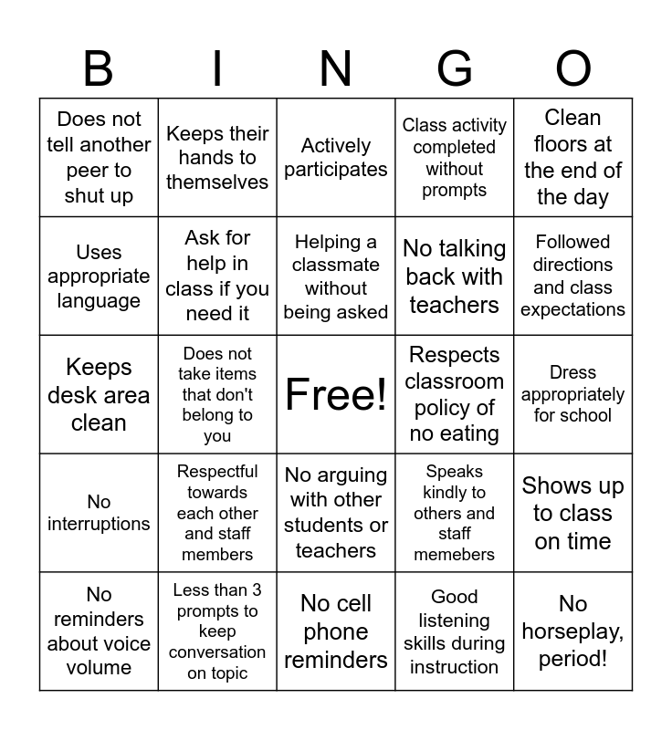 This bingo card has a free space and 24 words: No reminders about voice volume, Respectful towards each other and staff members, Helping a classmate without being asked, Good listening skills during instruction, Clean floors at the end of the day, Does not tell another peer to shut up, Keeps their hands to themselves, Actively participates, Respects classroom policy of no eating, Dress appropriately for school, Keeps desk area clean, Ask for help in class if you need it, Speaks kindly to others and staff memebers, Shows up to class on time, Uses appropriate language, Less than 3 prompts to keep conversation on topic, No cell phone reminders, Class activity completed without prompts, Followed directions and class expectations, No interruptions, Does not take items that don't belong to you, No arguing with other students or teachers, No talking back with teachers and No horseplay, period!.