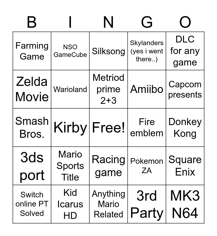 This bingo card has a free space and 24 words: Mario Sports Title, Kid Icarus HD, Metriod prime 2+3, Switch online PT Solved, DLC for any game, Farming Game, Zelda Movie, NSO GameCube, Fire emblem, Racing game, Amiibo, Smash Bros., Pokemon ZA, Square Enix, Warioland, 3rd Party, Donkey Kong, Silksong, Capcom presents, Kirby, MK3 N64, 3ds port, Skylanders (yes i went there..) and Anything Mario Related.