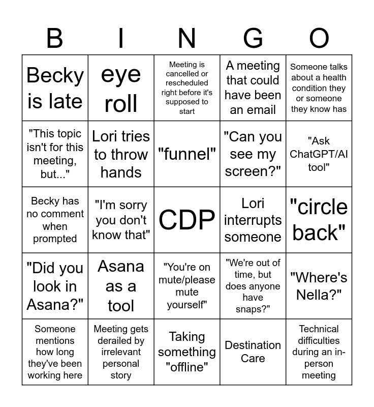 This bingo card has a free space and 25 words: Asana as a tool, Taking something "offline", "funnel", Someone mentions how long they've been working here, Someone talks about a health condition they or someone they know has, Becky is late, "This topic isn't for this meeting, but...", eye roll, Lori interrupts someone, "You're on mute/please mute yourself", "Can you see my screen?", Becky has no comment when prompted, "We're out of time, but does anyone have snaps?", "Where's Nella?", Lori tries to throw hands, "I'll bring that up at the next director's meeting", "circle back", Meeting is cancelled or rescheduled right before it's supposed to start, "Ask ChatGPT/AI tool", "I'm sorry you don't know that", Technical difficulties during an in-person meeting, Meeting gets derailed by irrelevant personal story, "Did you look in Asana?", A meeting that could have been an email and Destination Care.