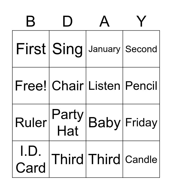 This bingo card has 43 words: Baby, I.D. Card, Party Hat, Sing, Balloon, March, January, December, Free!, First, Second, Third, Fourth, Party, Cake, Candle, Family, Baby, I.D. Card, Party Hat, Sing, Balloon, March, First, Second, Third, Fourth, Party, Cake, Candle, Family, Monday, Wednesday, Friday, January, December, Eraser, Pencil, Chair, Ruler, Point, Listen and Question.