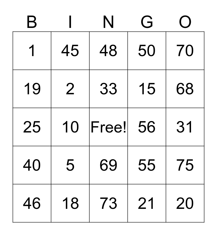 This bingo card has a free space and 24 words: 5, 18, 33, 46, 70, 1, 19, 45, 56, 69, 15, 25, 55, 75, 2, 21, 31, 48, 68, 10, 20, 40, 50 and 73.
