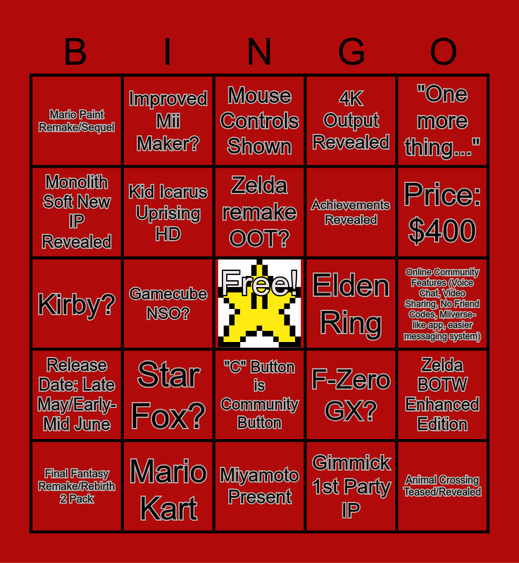 This bingo card has a free space and 29 words: 3D Mario Revealed, Mario Kart, Mouse Controls Shown, UI Shown, "One more thing...", Mario Paint Remake/Sequel, Kid Icarus Uprising HD, Zelda remake OOT?, Elden Ring, Zelda BOTW Enhanced Edition, Final Fantasy Remake/Rebirth 2 Pack, Gamecube NSO?, Gimmick 1st Party IP, Animal Crossing Teased/Revealed, Kirby?, Mario Kart: *Sub Title* no numeral title, Miyamoto Present, F-Zero GX?, Price: $400, Release Date: Late May/Early-Mid June, Star Fox?, 3D Mario Open World (like Bowser's Fury), Achievements Revealed, Online Community Features (Voice Chat, Video Sharing, No Friend Codes, Miiverse-like app, easier messaging system), Monolith Soft New IP Revealed, Improved Mii Maker?, "C" Button is Community Button, 4K Output Revealed and Old Joycons will work on Switch 2.