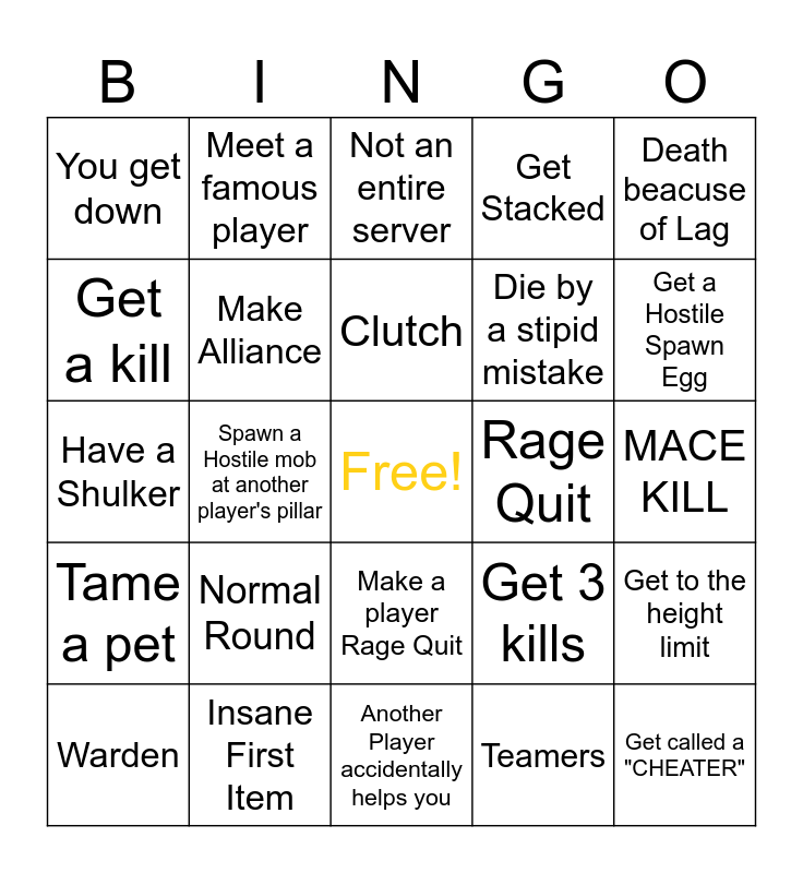 This bingo card has a free space and 24 words: Normal Round, Insane First Item, Clutch, Warden, Death beacuse of Lag, You get down, Get a kill, Meet a famous player, Rage Quit, Make a player Rage Quit, Die by a stipid mistake, Have a Shulker, Get 3 kills, Get to the height limit, Make Alliance, Teamers, MACE KILL, Not an entire server, Get a Hostile Spawn Egg, Spawn a Hostile mob at another player's pillar, Get called a "CHEATER", Tame a pet, Get Stacked and Another Player accidentally helps you.
