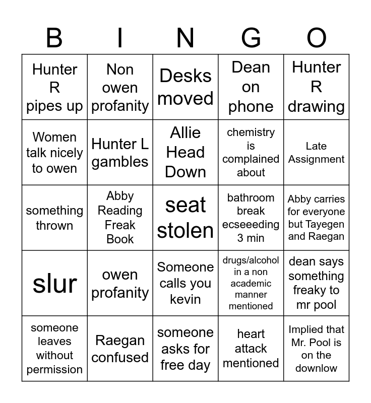 This bingo card has a free space and 24 words: owen profanity, Raegan confused, Allie Head Down, someone leaves without permission, Hunter R drawing, Hunter R pipes up, Women talk nicely to owen, Non owen profanity, bathroom break ecseeeding 3 min, Someone calls you kevin, chemistry is complained about, something thrown, drugs/alcohol in a non academic manner mentioned, dean says something freaky to mr pool, Hunter L gambles, heart attack mentioned, Abby carries for everyone but Tayegen and Raegan, Desks moved, Late Assignment, Abby Reading Freak Book, Implied that Mr. Pool is on the downlow, slur, Dean on phone and someone asks for free day.