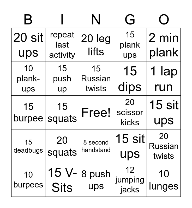 This bingo card has a free space and 29 words: 10 burpees, 20 push ups, 15 squats, 20 jumping jacks, 20 sit ups, 20 leg lifts, 15 push up, 20 squats, 20 scissor kicks, 15 V-Sits, 15 sit ups, 10 lunges, 8 push ups, 12 jumping jacks, 1 lap run, air cycling 2 min, 8 second handstand, 15 deadbugs, 2 min plank, 15 burpee, 15 sit ups, 2 laps run, 15 dips, 10 plank-ups, 15 plank ups, repeat last activity, 20 Russian twists, 15 Russian twists and 60 second side plank.