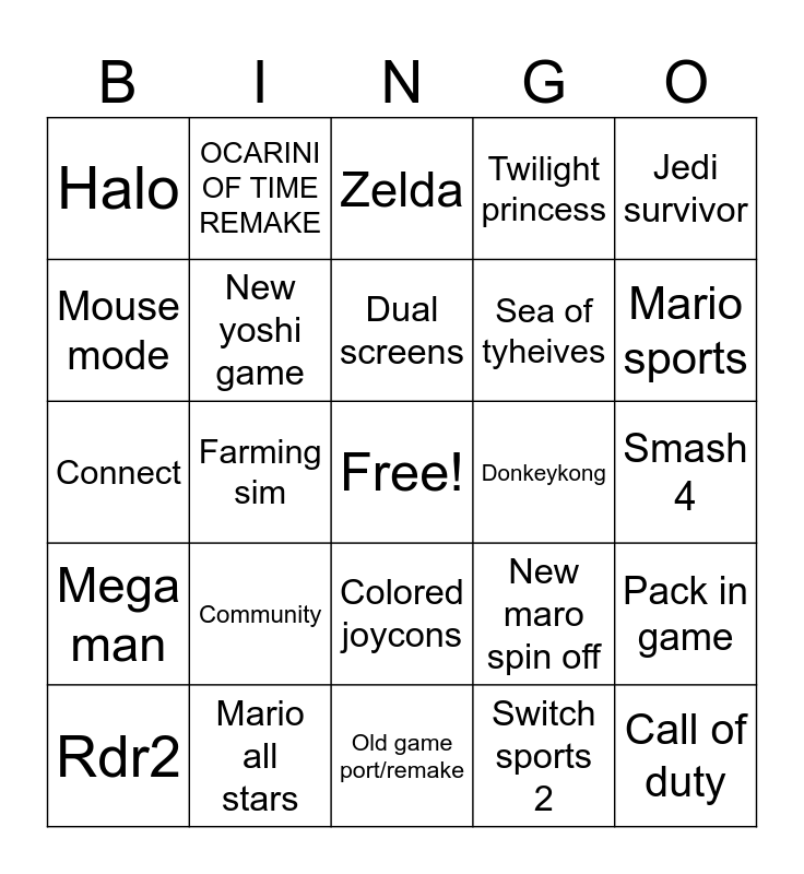 This bingo card has a free space and 78 words: 3d, 3d mario, Zelda, Metroid prime 4, Pokemon za, New ui, Eshop music, Home menu music, Mii maker, Ds online, Gamecube online, Wind waker, Twilight princess, Halo, Forza, Mouse mode, Chat, Community, Cast, Smash 4, Star wars outlaws, Jedi survivor, Connect, Dual screens, New yoshi game, Mk1 enhanced, Botw 4k, Star fox, Fzero, Mario paint, Mario sports, Mario maker., Old game port/remake, Luigis mansion 4, Rdr2, Donkeykong, Kirby, Elden ring, Microsoft flight, Call of duty, Black myth wu kong, GTA VI, 12 switch, Rayman, Marvel rivals, OCARINI OF TIME REMAKE, INDIE, Mario party, Wario ware, Split fiction, Pack in game, Farming sim, New maro spin off, WALUIGI GAME!!!, Wario land, Resident evil, Dumb book game, Star field, Madden 24/5/6, Colored joycons, Sea of tyheives, Doom, Kid icarus, Final fantasy, Splat 4, Peach game, New mario spin off, Mario kart 9, Mega man, Mario all stars, Mario rpg, Mario and lugi, Mario party, Mario paint, Switch sports 2, Fina; fantasy, Yooka replalee and miamoto/sakuri.