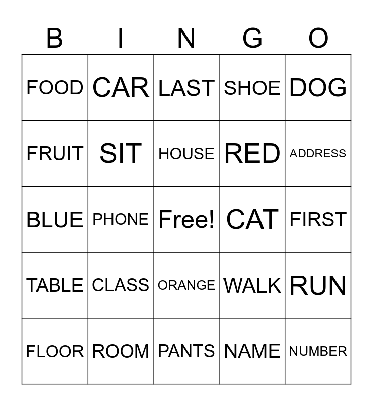 This bingo card has a free space and 24 words: CLASS, ROOM, HOUSE, FLOOR, DOG, FOOD, FRUIT, CAR, CAT, ORANGE, RED, BLUE, WALK, RUN, SIT, NAME, FIRST, LAST, ADDRESS, PHONE, NUMBER, TABLE, SHOE and PANTS.