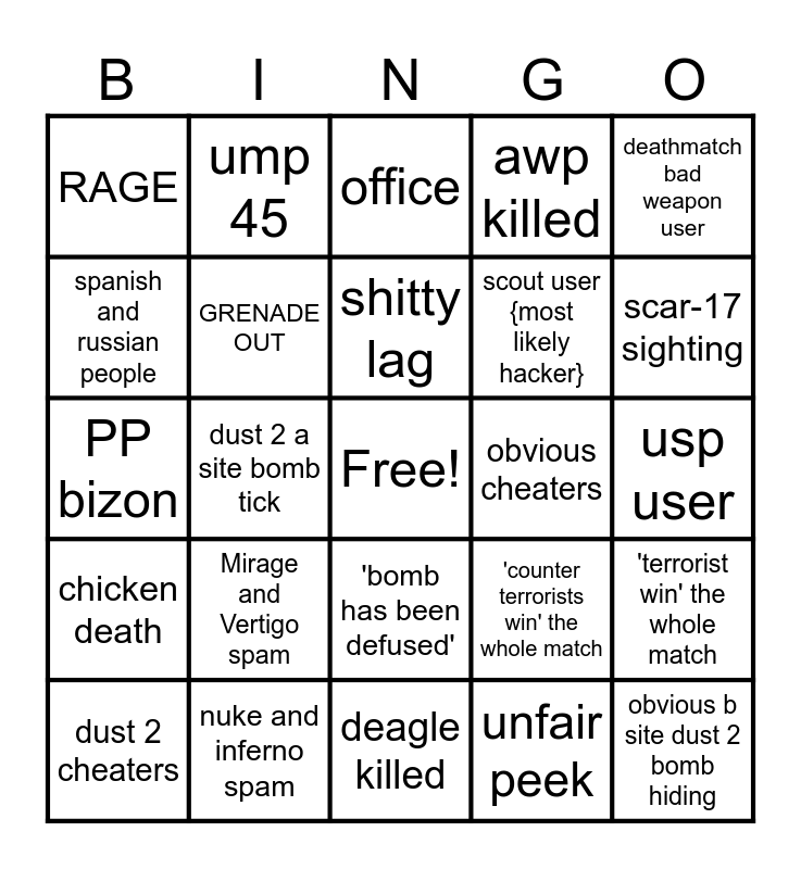 This bingo card has a free space and 24 words: Mirage and Vertigo spam, nuke and inferno spam, shitty lag, dust 2 cheaters, deathmatch bad weapon user, RAGE, spanish and russian people, ump 45, obvious cheaters, 'bomb has been defused', scout user {most likely hacker}, PP bizon, 'counter terrorists win' the whole match, 'terrorist win' the whole match, GRENADE OUT, unfair peek, usp user, office, scar-17 sighting, dust 2 a site bomb tick, obvious b site dust 2 bomb hiding, chicken death, awp killed and deagle killed.