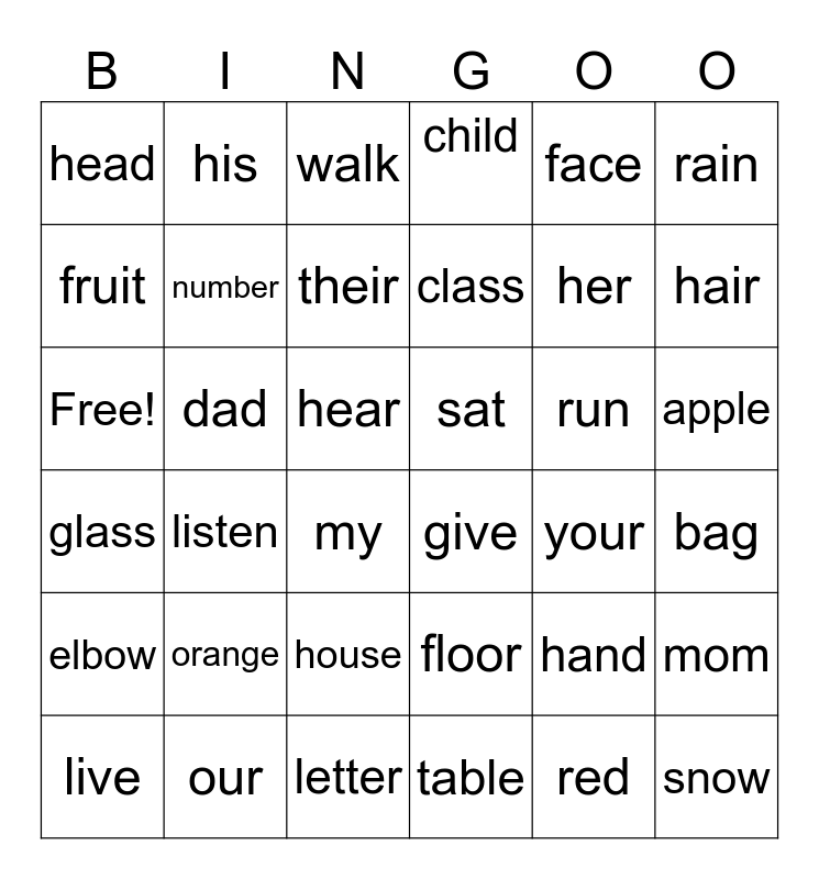 This bingo card has 36 words: floor, house, table, fruit, glass, sat, number, letter, face, hand, hair, child, mom, dad, class, head, elbow, run, Free!, walk, hear, listen, give, my, your, his, her, our, their, rain, snow, live, bag, apple, orange and red.