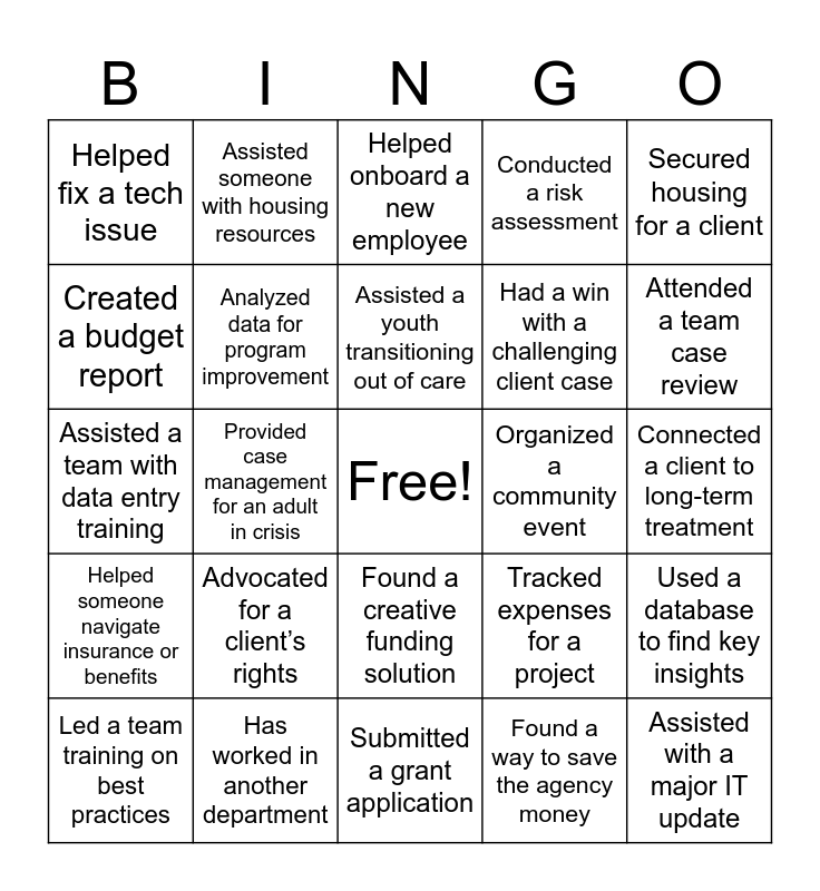 This bingo card has a free space and 48 words: Has worked here for 5+ years, Has worked in another department, Conducted a mental health training, Provided crisis intervention, Attended a team case review, Developed a new outreach strategy, Assisted someone with housing resources, Connected a client to rehab services, Organized a community event, Processed payroll correctly & on time, Created a budget report, Analyzed data for program improvement, Assisted a youth in crisis, Used a database to find key insights, Reviewed a new policy, Conducted a job interview, Helped onboard a new employee, Tracked expenses for a project, Facilitated a staff training, Helped fix a tech issue, Advocated for a client’s rights, Submitted a grant application, Conducted a risk assessment, Secured housing for a client, Conducted a suicide prevention training, Provided case management for an adult in crisis, Assisted a youth transitioning out of care, Organized a team-building activity, Connected a client to long-term treatment, Helped someone navigate insurance or benefits, Balanced a department budget, Wrote a case note right after a session, Used data to support a funding request, Designed or improved a staff workflow, Led a team training on best practices, Made a referral to another agency, Facilitated a support group, Found a way to save the agency money, Assisted with a major IT update, Spoke at a public event or meeting, Provided support in a court hearing, Found a creative funding solution, Had a win with a challenging client case, Created or improved a spreadsheet formula, Assisted a team with data entry training, Ensured data integrity for compliance, Designed a survey to collect better feedback and Developed a new metric for performance tracking.
