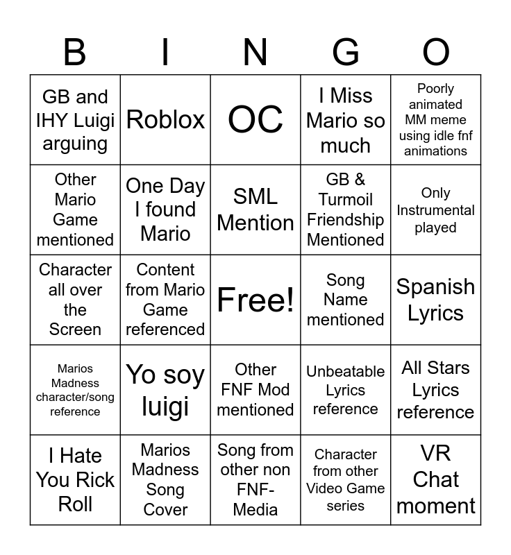 This bingo card has a free space and 24 words: I Hate You Rick Roll, Yo soy luigi, SML Mention, Character from other Video Game series, Poorly animated MM meme using idle fnf animations, GB and IHY Luigi arguing, Roblox, OC, Song Name mentioned, Spanish Lyrics, Character all over the Screen, One Day I found Mario, Unbeatable Lyrics reference, All Stars Lyrics reference, Other Mario Game mentioned, Marios Madness Song Cover, Song from other non FNF-Media, I Miss Mario so much, Only Instrumental played, Marios Madness character/song reference, Content from Mario Game referenced, Other FNF Mod mentioned, GB & Turmoil Friendship Mentioned and VR Chat moment.