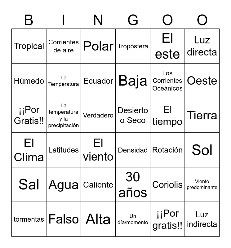 This bingo card has 36 words: 30 años, Caliente, Un día/momento, Húmedo, El Clima, Desierto o Seco, La Temperatura, Alta, El este, Coriolis, Oeste, Tropósfera, Viento predominante, La temperatura y la precipitación, Baja, Tropical, Sal, El tiempo, ¡¡Por Gratis!!, Polar, Verdadero, Latitudes, Densidad, El viento, Rotación, Corrientes de aire, Los Corrientes Oceánicos, Falso, Ecuador, Luz directa, Luz indirecta, tormentas, Sol, Tierra, Agua and ¡¡Por gratis!!.