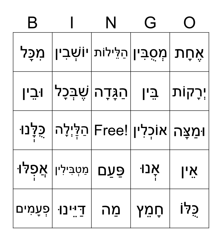 This bingo card has a free space and 31 words: מַה, נִּשְׁתַּנָּה, הַלַּֽיְלָה, הַזֶּה, מִכָּל, הַלֵּילוֹת, שֶׁבְּכָל, אָֽנוּ, אוֹכְלִין, חָמֵץ, וּמַצָּה, כֻּלּוֹ, מַצָּה, שְׁאָר, יְרָקוֹת, מָרוֹר, אֵין, מַטְבִּילִין, אֲפִֽלּוּ, פַּעַם, אֶחָת, שְׁתֵּי, פְעָמִים, יוֹשְׁבִין, בֵּין, וּבֵין, מְסֻבִּין, כֻּלָּֽנוּ, דַּיֵּינוּ, הַגָּדָה and פֶּסַח.