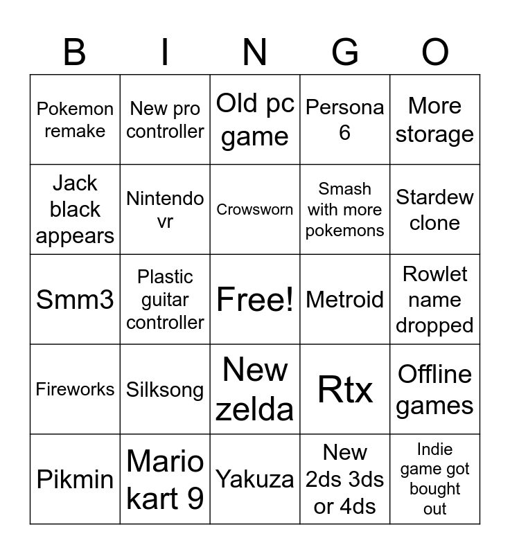This bingo card has a free space and 24 words: Silksong, Mario kart 9, Crowsworn, Pikmin, More storage, Pokemon remake, Jack black appears, New pro controller, Metroid, New zelda, Smash with more pokemons, Smm3, Rtx, Offline games, Nintendo vr, New 2ds 3ds or 4ds, Rowlet name dropped, Old pc game, Stardew clone, Plastic guitar controller, Indie game got bought out, Fireworks, Persona 6 and Yakuza.