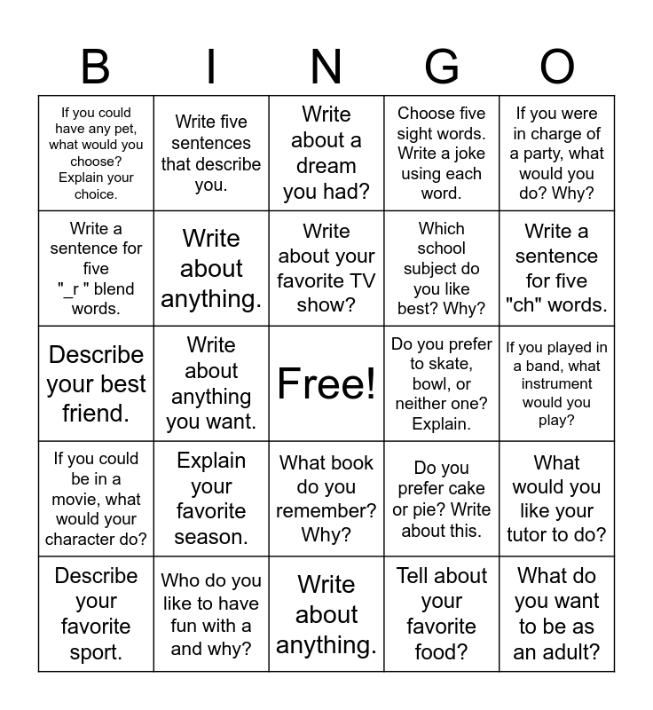 This bingo card has a free space and 24 words: Explain your favorite season., Who do you like to have fun with a and why?, Write about your favorite TV show?, Describe your favorite sport., If you were in charge of a party, what would you do? Why?, If you could have any pet, what would you choose? Explain your choice., Write a sentence for five "_r " blend words., Write five sentences that describe you., Do you prefer to skate, bowl, or neither one? Explain., What book do you remember? Why?, Which school subject do you like best? Why?, Describe your best friend., Do you prefer cake or pie? Write about this., What would you like your tutor to do?, Write about anything., Tell about your favorite food?, If you played in a band, what instrument would you play?, Write about a dream you had?, Write a sentence for five "ch" words., Write about anything you want., What do you want to be as an adult?, If you could be in a movie, what would your character do?, Choose five sight words. Write a joke using each word. and Write about anything..