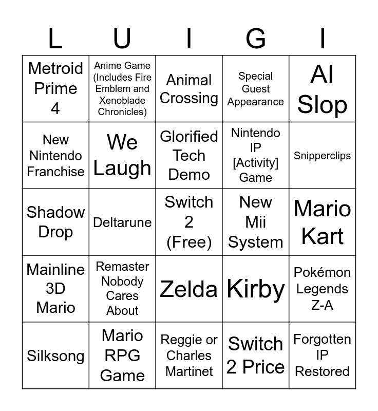 This bingo card has a free space and 24 words: Remaster Nobody Cares About, Mario RPG Game, Glorified Tech Demo, Silksong, AI Slop, Metroid Prime 4, New Nintendo Franchise, Anime Game (Includes Fire Emblem and Xenoblade Chronicles), New Mii System, Zelda, Nintendo IP [Activity] Game, Shadow Drop, Kirby, Pokémon Legends Z-A, We Laugh, Switch 2 Price, Mario Kart, Animal Crossing, Snipperclips, Deltarune, Forgotten IP Restored, Mainline 3D Mario, Special Guest Appearance and Reggie or Charles Martinet.