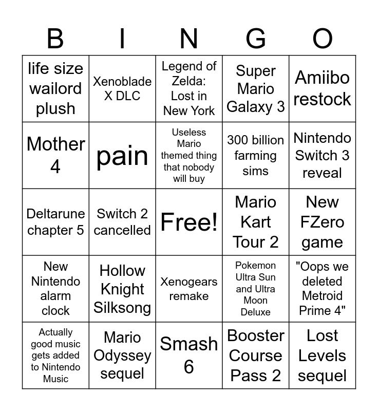 This bingo card has a free space and 24 words: Hollow Knight Silksong, Mario Odyssey sequel, Useless Mario themed thing that nobody will buy, Actually good music gets added to Nintendo Music, Amiibo restock, life size wailord plush, Mother 4, Xenoblade X DLC, Mario Kart Tour 2, Xenogears remake, 300 billion farming sims, Deltarune chapter 5, Pokemon Ultra Sun and Ultra Moon Deluxe, "Oops we deleted Metroid Prime 4", pain, Booster Course Pass 2, New FZero game, Legend of Zelda: Lost in New York, Nintendo Switch 3 reveal, Switch 2 cancelled, Lost Levels sequel, New Nintendo alarm clock, Super Mario Galaxy 3 and Smash 6.