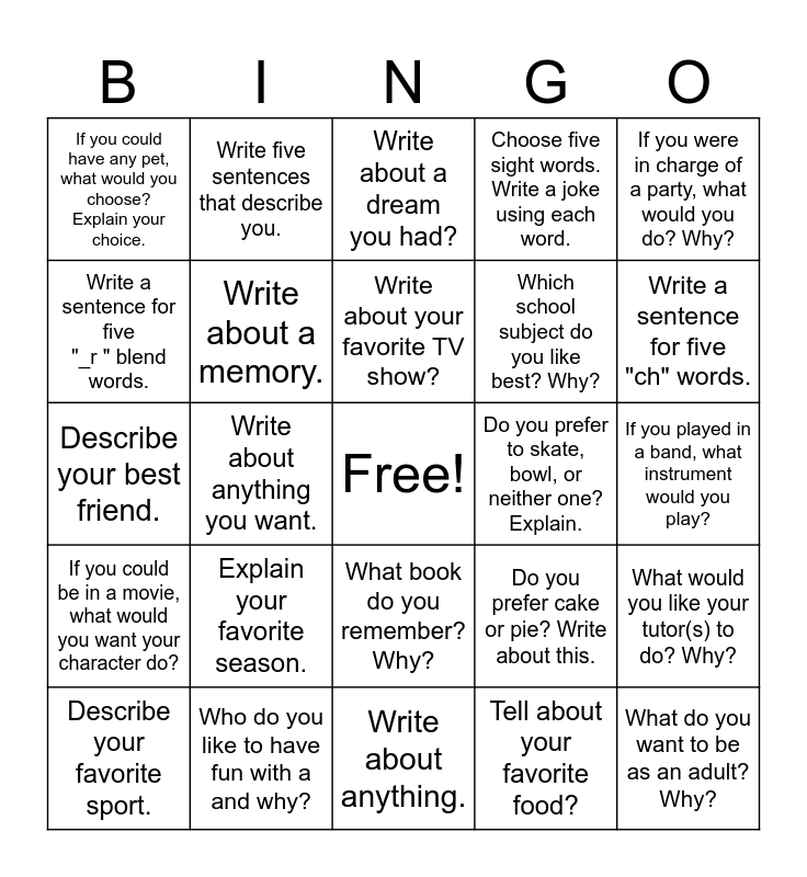 This bingo card has a free space and 24 words: Explain your favorite season., Who do you like to have fun with a and why?, Write about your favorite TV show?, Describe your favorite sport., If you were in charge of a party, what would you do? Why?, If you could have any pet, what would you choose? Explain your choice., Write a sentence for five "_r " blend words., Write five sentences that describe you., Do you prefer to skate, bowl, or neither one? Explain., What book do you remember? Why?, Which school subject do you like best? Why?, Describe your best friend., Do you prefer cake or pie? Write about this., What would you like your tutor(s) to do? Why?, Write about a memory., Tell about your favorite food?, If you played in a band, what instrument would you play?, Write about a dream you had?, Write a sentence for five "ch" words., Write about anything you want., What do you want to be as an adult? Why?, If you could be in a movie, what would you want your character do?, Choose five sight words. Write a joke using each word. and Write about anything..