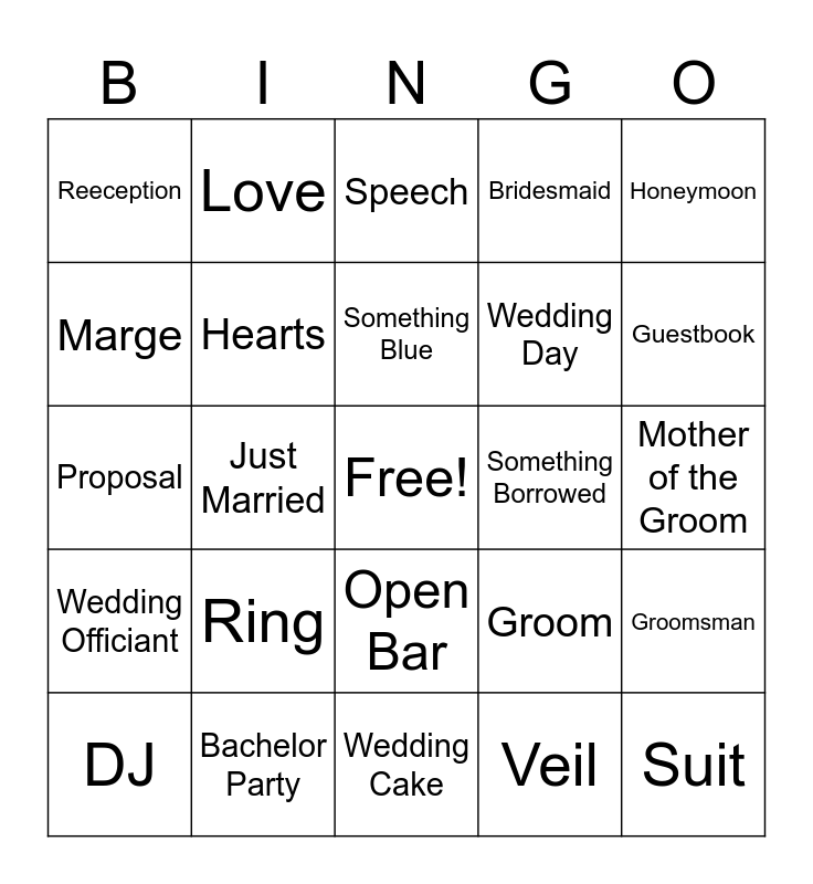 This bingo card has a free space and 49 words: Dress, Suit, Bouquet of Flowers, Wedding Cake, Ring, First Dance, Love, Kiwi, Marge, Bride, Hearts, Bridesmaid, Groomsman, Groom, "I Do", Champagne Toast, Something Blue, Something Borrowed, Vows, Honeymoon, Just Married, Veil, Reeception, Wedding Day, Invitations, Guestbook, DJ, Dancing, Open Bar, Wedding Officiant, Cake Cutting, First Look, Taking Pictures, Bachelorette Party, Bachelor Party, Engagement Photos, Save the Date, Mother of the Bride, Mother of the Groom, Father of the Bride, Father of the Groom, Luxmont Farms, Heels, Cocktail, Proposal, Speech, 2025, June and One.